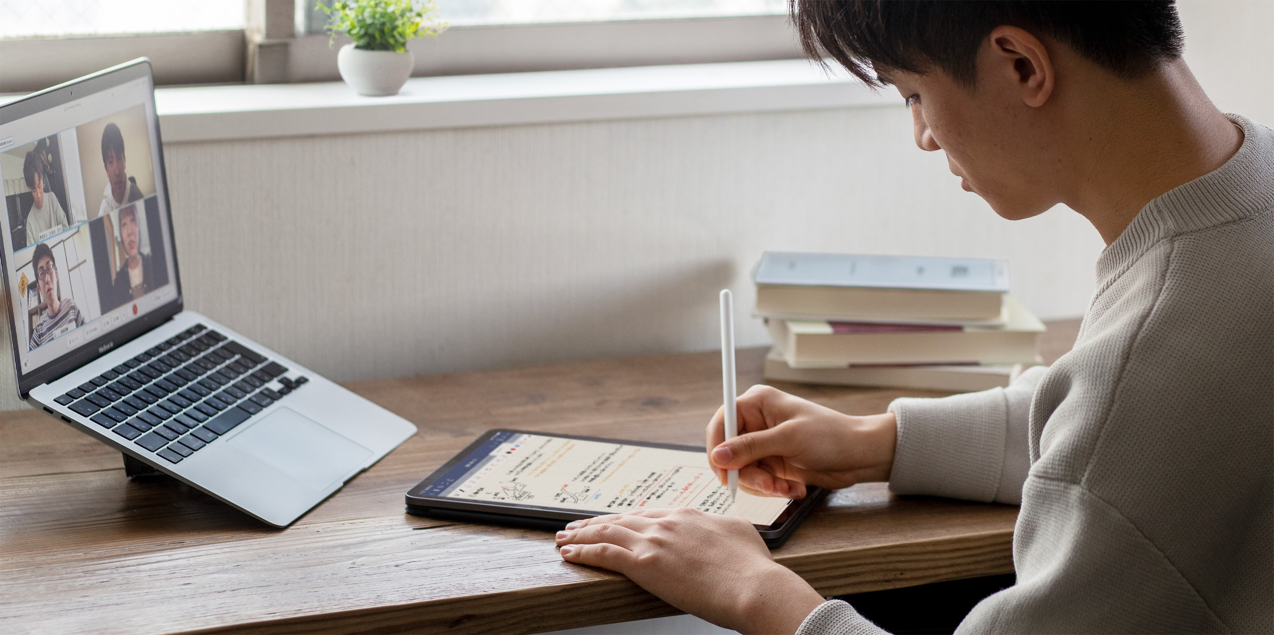 Zoals veel studenten heeft Takuto zich ook aangepast aan leren op afstand door te profiteren van geavanceerde technologie. Tijdens online colleges gebruikte hij Split Screen op iPad, met de presentatie van zijn professor aan de ene kant en de mogelijkheid om aantekeningen te maken aan de andere kant. En tijdens virtuele studiegroepen gebruikte Takuto FaceTime op Mac om in contact te komen met medestudenten, terwijl hij het indrukwekkende tekencanvas op iPad gebruikte voor zijn groepsprojecten.