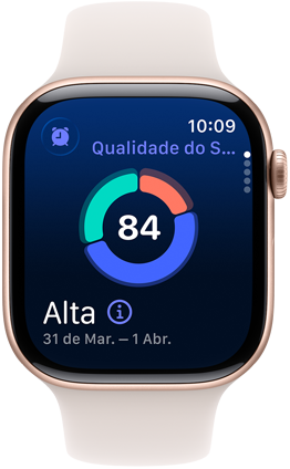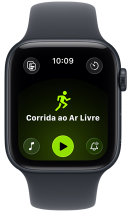 Explorar o Apple Watch Três modelos de Apple Watch, o do centro na cor natural com a tela exibindo uma corrida em andamento com estatísticas de frequência cardíaca, o da direita na cor preto brilhante com a tela exibindo um Genmoji, o da esquerda na cor estelar com a tela exibindo o app Sinais Vitais