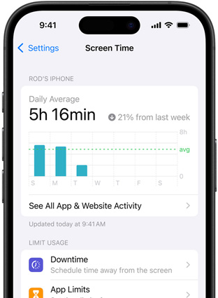 Screen Time gives you a better understanding of the time you and your kids spend using apps, visiting websites and on your devices overall. You can get weekly reports or see specific app usage, notifications and device pickups.