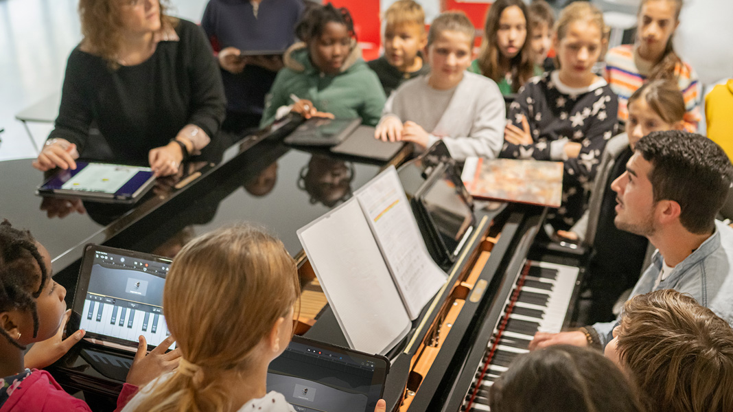 Avec l’intégration de ces nouvelles méthodes pédagogiques dans la classe, les élèves s’épanouissent. En cours de musique, des élèves se regroupent autour d’un piano pour jouer et composer leur propre musique en utilisant Pages et l’Apple Pencil. D’autres créent et enregistrent des sons dans GarageBand pour accompagner leurs camarades qui jouent d’un instrument. En cours de programmation, les élèves utilisent CoSpaces Edu sur iPad pour produire des créations en 3D, et Swift Playgrounds pour animer des objets dans des environnements de réalité augmentée et de réalité virtuelle.