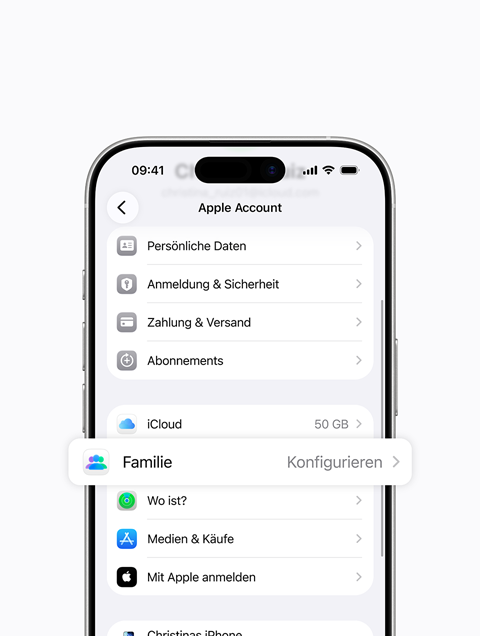 • Wenn deine Kinder deinen Apple Account nutzen, können sie auf deine persönlichen Inhalte, einschließlich Nachrichten und Fotos, zugreifen. Außerdem kannst du dann nicht alle verfügbaren Features der Familie nutzen.