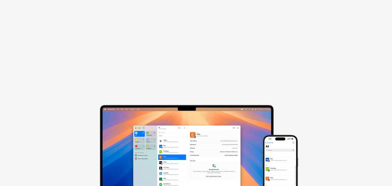 Mit der Passwörter App kannst du auf deine Account-Passwörter, Passkeys, WLAN Passwörter und Verifizierungscodes zugreifen – an einem Ort. Sie hilft bei der geräteübergreifenden Verwaltung von Anmeldeinformationen mit iCloud und warnt dich vor unsicheren Passwörtern. Du kannst starke Passwörter erstellen, speichern, anpassen, sie mit anderen teilen und mehr.