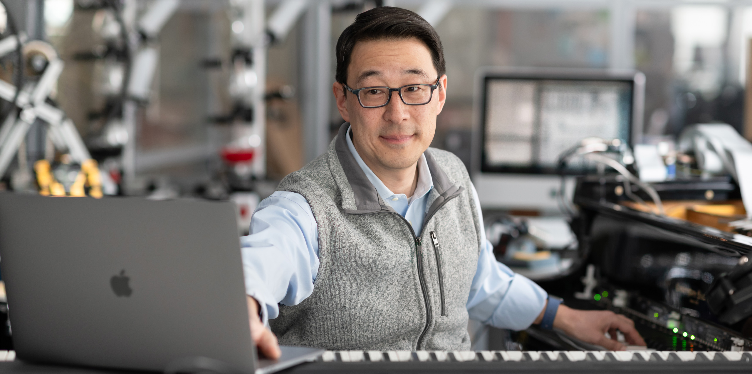 MacBook Pro. Mac easily handles pro music and visualization apps — like Logic Pro and MATLAB — to push the boundaries of Dr. Kim’s machine listening research using instruments and robots he builds himself.