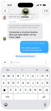 Activa Traducción en Tiempo Real para traducir textos automáticamente en Mensajes,1 subtítulos en vivo en FaceTime y llamadas en voz alta en Teléfono.2
