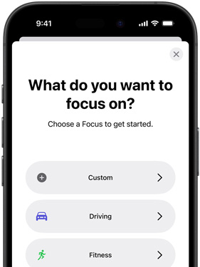 No one should be distracted by the phone while driving. With the Driving Focus, iPhone won’t interrupt you with messages, calls, or notifications until you reach your destination. In an emergency, callers can override it and get through.