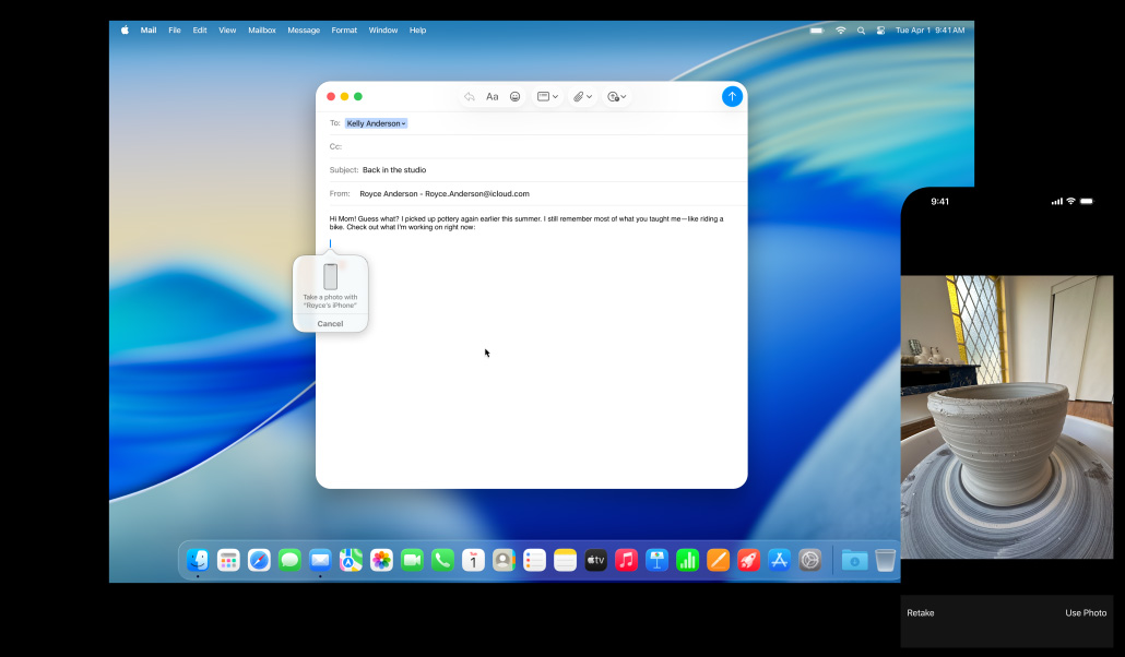 透過相機接續互通功能,你用 iPhone 拍攝的相片,可即時在你的 Mac 上電郵顯示出來;用 iPhone 掃描的收據,可直接在訊息 app 出現,並已自動裁剪和拉直,隨時都可分享出去。相機接續互通功能可與備忘錄、Pages 和 Keynote 等眾多 app 配合使用,令 iPhone 與 Mac 之間的合作,更合拍。相機接續互通功能更為視像通話解鎖不同新功能,例如當你使用 FaceTime 及 Zoom,可利用桌上視角功能,以俯視角度展示自己的工作空間;而在視像通話中,人物置中功能更會隨你移動,讓你時刻保持入鏡。