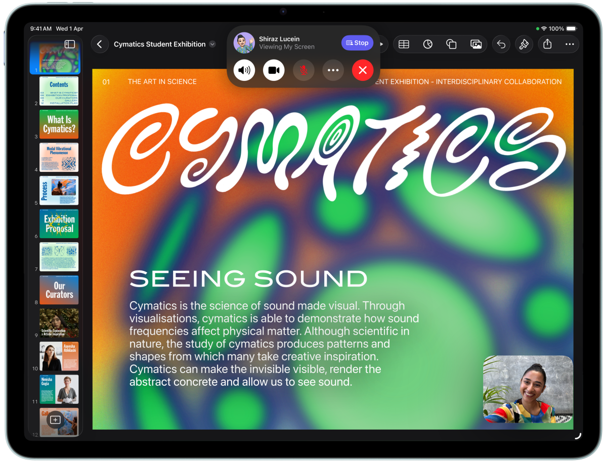 iPad Air, front exterior, user is on FaceTime and looking at Keynote in front of another iPad Air, back exterior