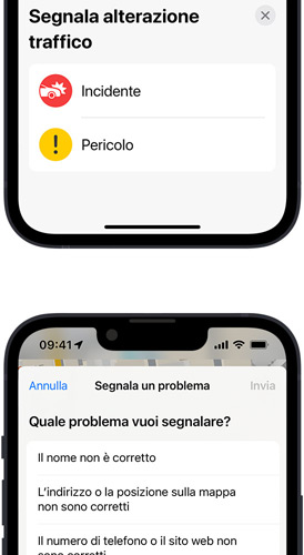Gli orari del tuo bar preferito sono sbagliati? C’è un vecchio materasso in mezzo alla strada? Qualunque sia il problema, basta un attimo per segnalarlo in Mappe. Modifica e invia informazioni aggiornate su un’attività commerciale direttamente nella scheda del luogo. E segnala un incidente o un pericolo nel modo più facile e sicuro: dillo a Siri. Devi solo dire “C’è un incidente più avanti” o “C’è qualcosa in strada” e Siri registrerà l’incidente per te. E puoi anche segnalare a Siri se un incidente indicato sulla mappa si è risolto, senza togliere le mani dal volante e gli occhi dalla strada.
