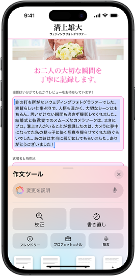 Apple Intelligenceは、毎日のコミュニケーションをシンプルにして、あなたが大事なことに集中し続けられるようにします。ライブ翻訳で言語の壁を越えてコミュニケーションする。作文ツールで、思い通りのトーンの文章にする。重要な通知を優先して表示して、気が散る原因を最小限に抑えることもできます。