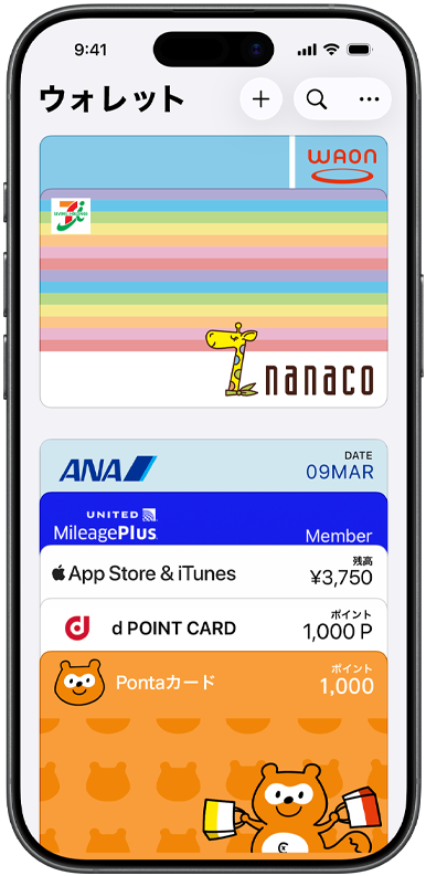 クレジットカードなどのカードを追加するには、ウォレットアプリを開いて「+」マークをタップし、対応するカードをiPhoneの背面にかざすだけです1。カードを手動で追加する場合は、ウォレットアプリを開いて「+」マークをタップし、画面上の手順に従ってください。銀行やカード会社による認証が行われます。Apple Watchをペアリングしている場合は、Apple Watchにカードを追加するかどうかも選べます。新しいiPhoneにアップグレードする時も、ワンステップで簡単にカードを移行できます。