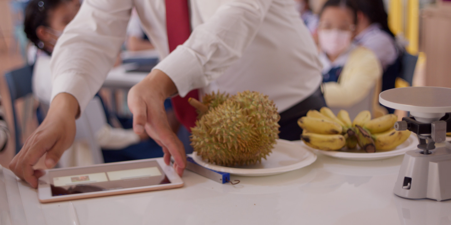 초등학교 과학 수업에서 학생들이 iPad를 사용해 다양한 과일의 질량을 조사하고 있습니다. -