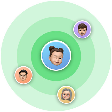 중심에 미모티콘이 있는 동심원이 레이더를 닮은 '나의 찾기' 앱의 '위치 공유' UI처럼 보입니다. 바깥 원에는 미모티콘이 세 개 더 배치되어 있습니다.