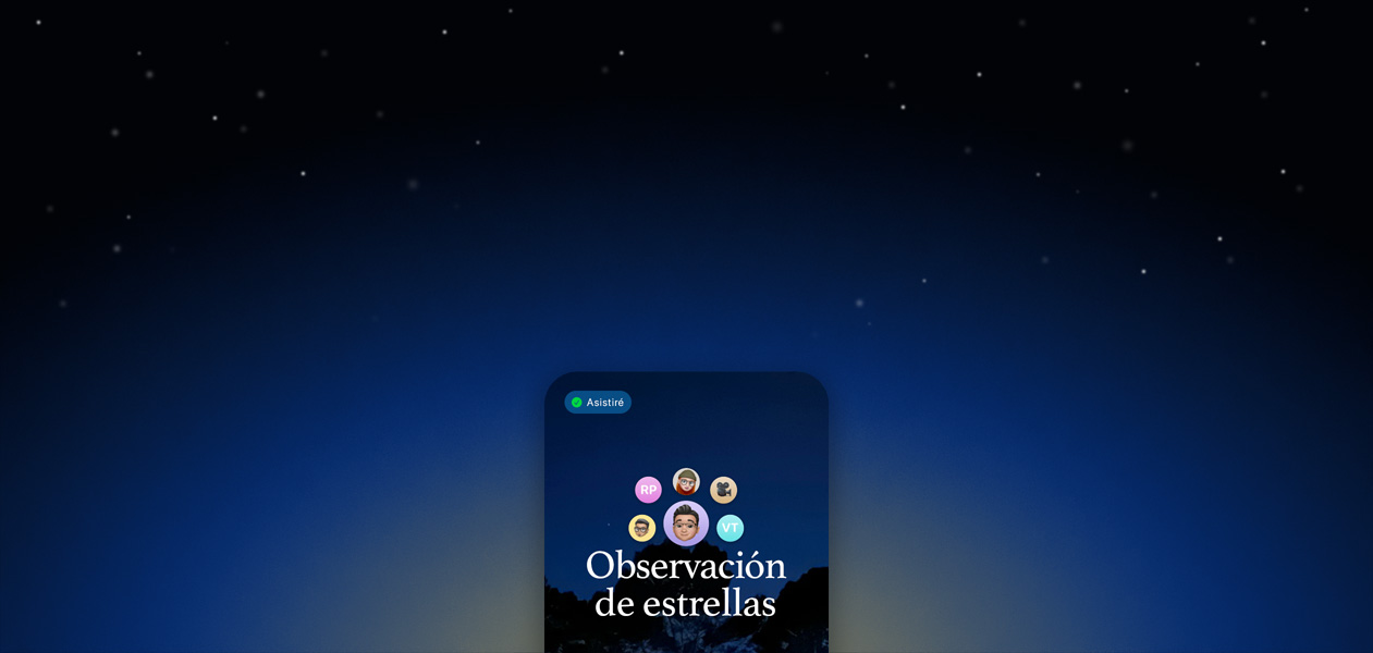 Invitaciones Apple es una nueva funcionalidad de iCloud+ que te ayuda a celebrar cualquier ocasión. Personaliza tu invitación con imágenes de tu fototeca o crea algo verdaderamente único con Image Playground.6 Agrega detalles como música, mapas o fotos, y llena de vida tu evento. Luego, envía tu invitación a quien quieras para que respondan y confirmen su asistencia.