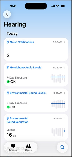 Privat, sigur și ușor de gestionat. Toate datele privind Testul auditiv sunt stocate în mod privat și securizat în aplicația Sănătate de pe dispozitivul tău. Poți relua testul oricând dorești, monitoriza auzul în timp, descărca rezultatele testului și citi articole utile despre sănătatea auzului.