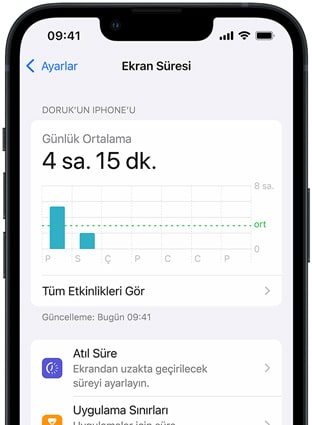 Ekran Süresi, çocuklarınızın ve sizin, uygulamaları kullanırken veya web sitelerini ziyaret ederken hangi aygıtlarda ne kadar zaman geçirdiğinizi genel olarak görmenize yardımcı oluyor. Haftalık raporlar almanıza veya bildirimleri, belirli uygulamaların ne kadar kullanıldığını, hem çocuğunuzun hem sizin, aygıtlarınızı kaç kez elinize aldığınızı görmenize de imkan tanıyor.